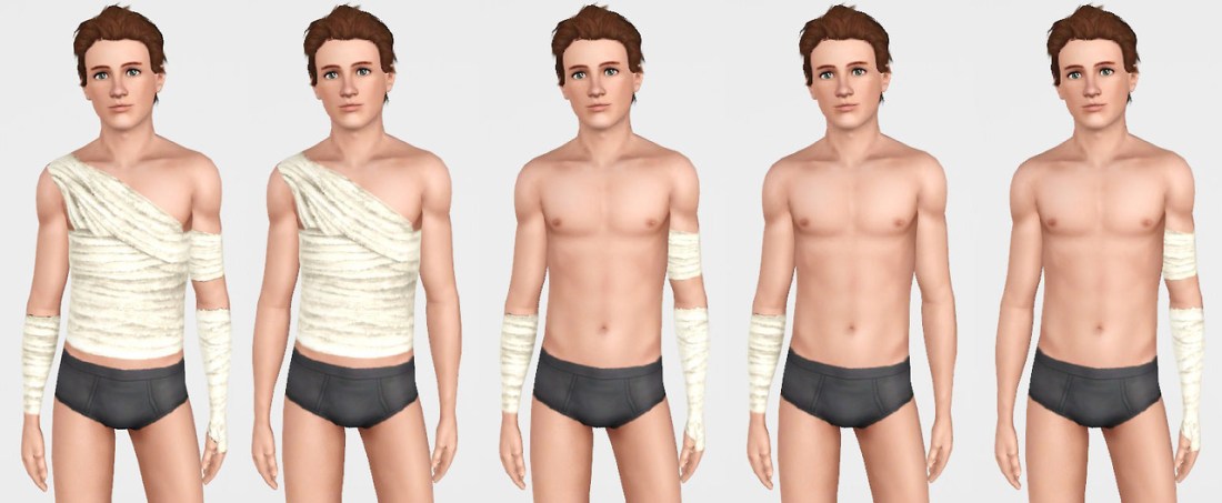 Torso and arm bandages are an accessory found under gloves. It comes with the presets shown above. I enabled it for all ages and genders, although it looks best on teen-to-elder males. It should stack over any wound texture accessories, if you place it last.