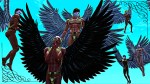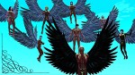 As if he has screamed at them instead, the band of angels takes sudden but brief flight, lingering in his proximity, more cautious than scared, like vultures leaving a corpse they still intend to return to.